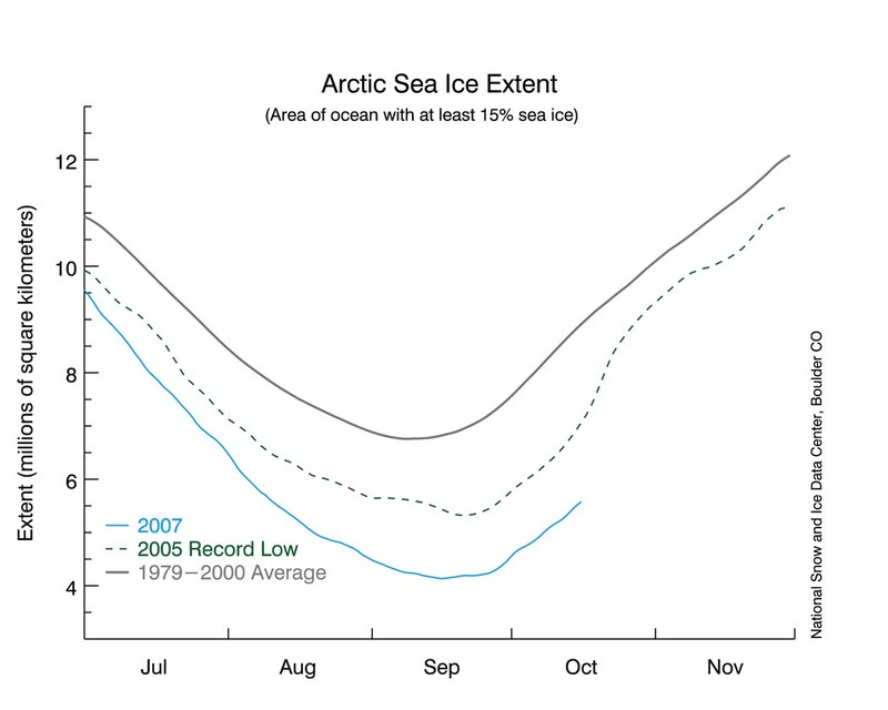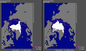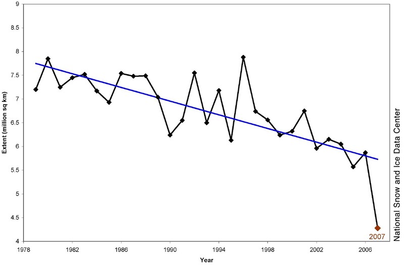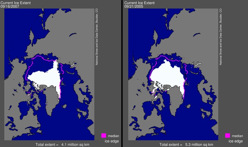 Le graphique suivant montre l’évolution de la surface de glace pour les mois de septembre successifs, depuis qu’on mesure cette surface par satellite (à la fin des années 1970). On note à la fois une diminution régulière et le caractère exceptionnel de l’année 2007. Cette particularité ne peut cependant pas être attribuée exclusivement au réchauffement global, des phénomènes météorologiques particuliers ayant favorisé la désaggrégation de la surface gelée. Enfin, le dernier graphique est une représentation de la surface de glace en septembre 2007 (à gauche) et septembre 2005 (à droite).